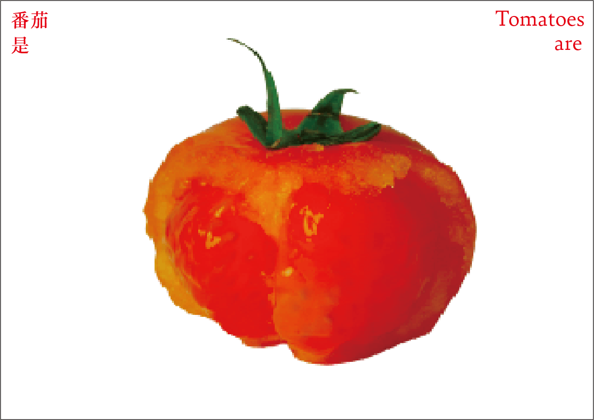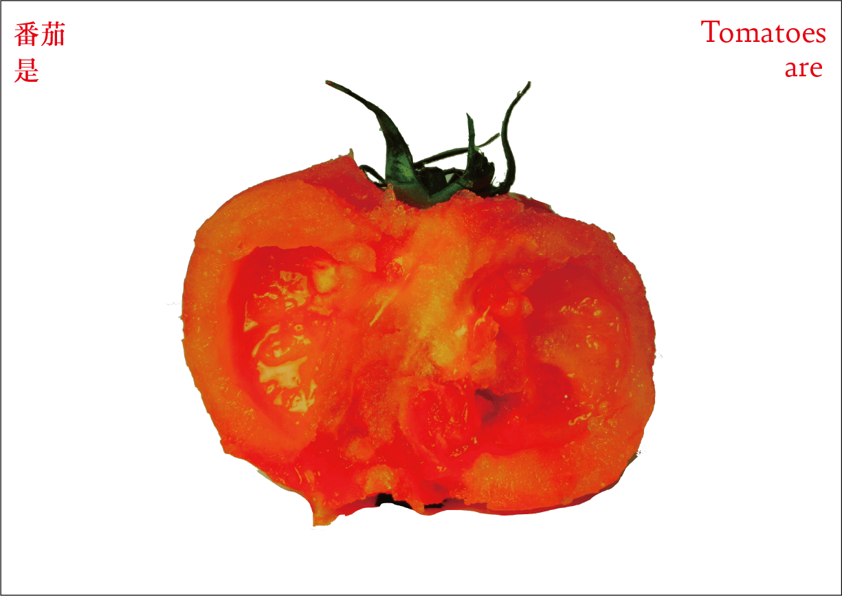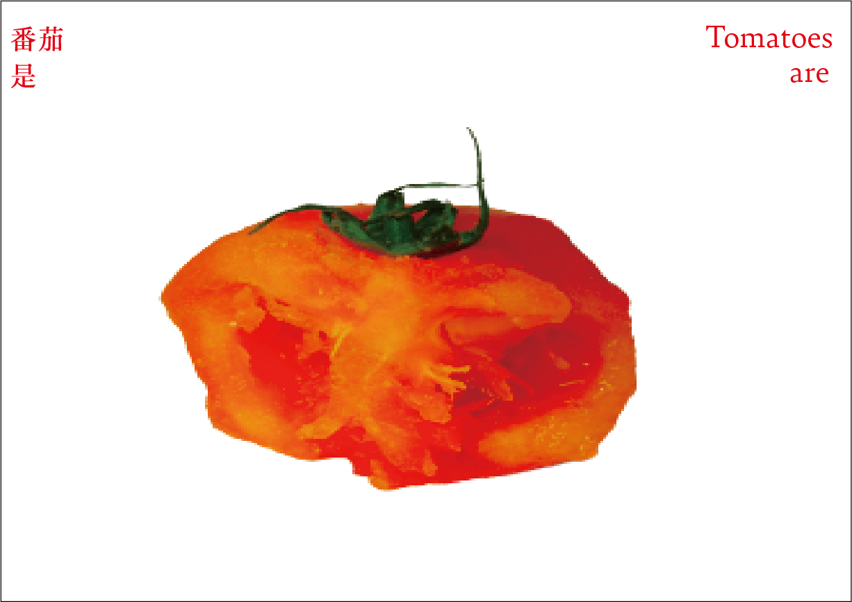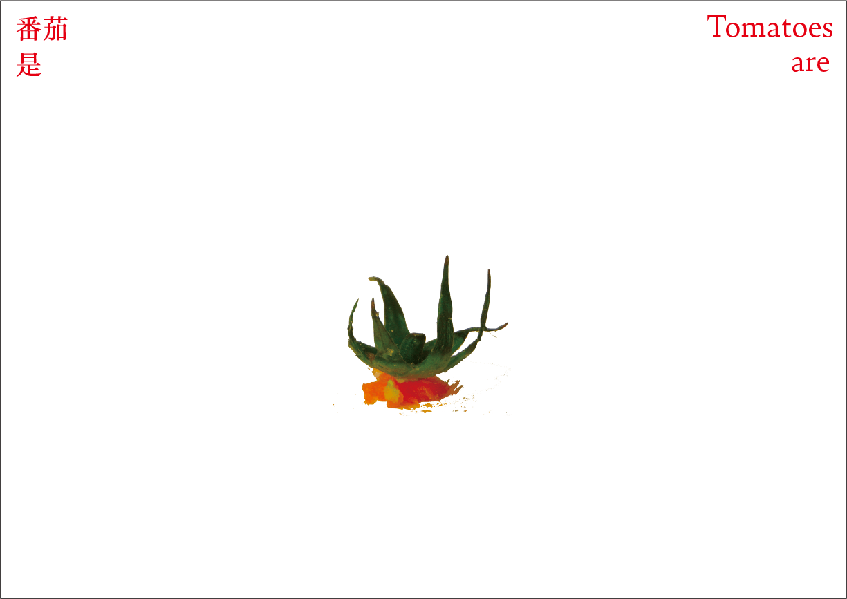 番茄作为一个符号,符号是有限的,客体的解释是无限的。卡片作为解释项,是主体对番茄加以认知、解释、感知、反应的过程和结果。卡片可以是一种思想观念,也可以是一种情绪,还可以是一种行动。通过联想分析,底层结构变得可见,新的形式出现。读者被邀请去感知和重新定义——重新思考已知的番茄轮廓,探索跟番茄有关的系统。