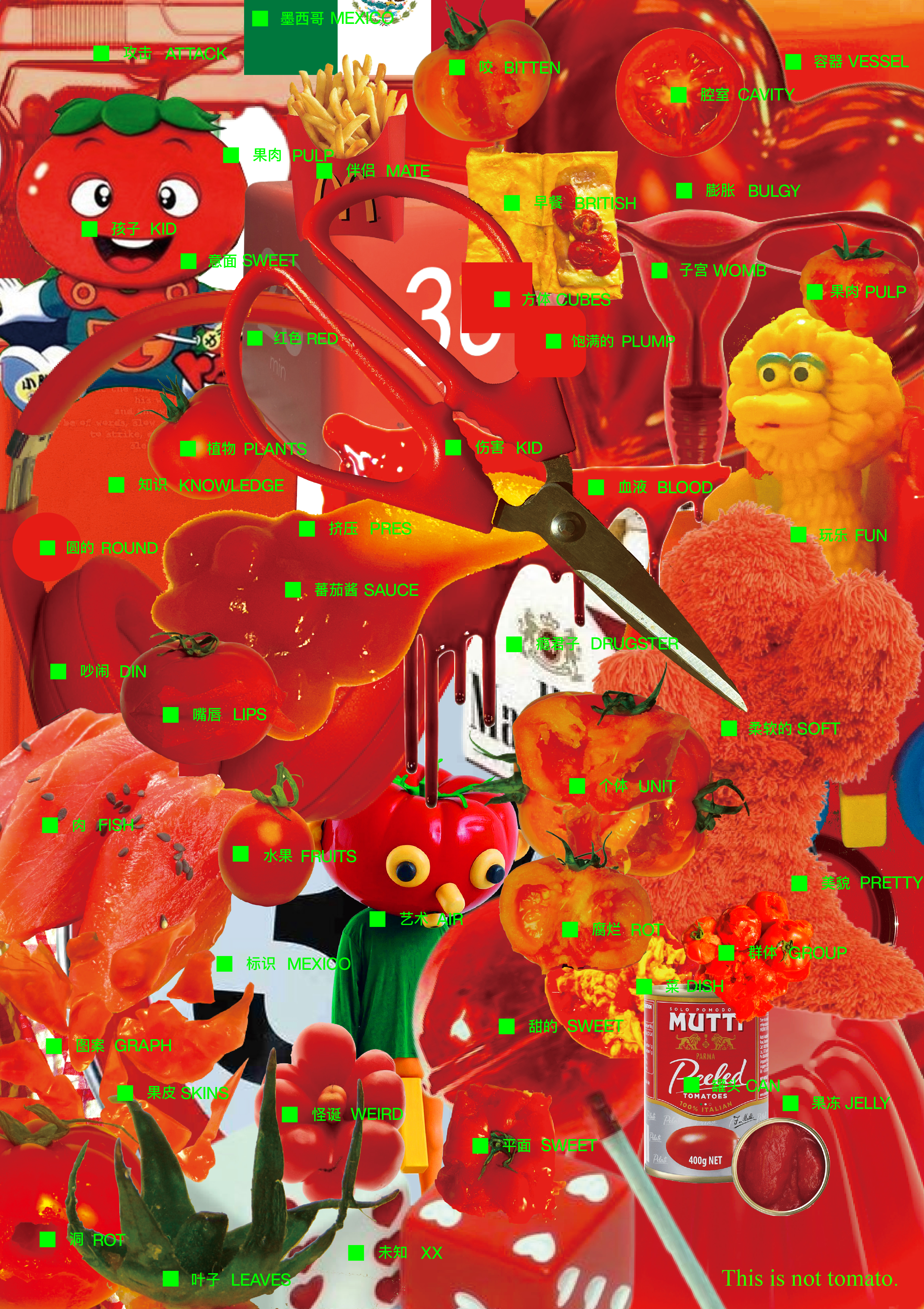 最终的海报把所有的解释项密集分布,他们变成了番茄的机理,卡片是番茄这个词语身上的基础单元,
